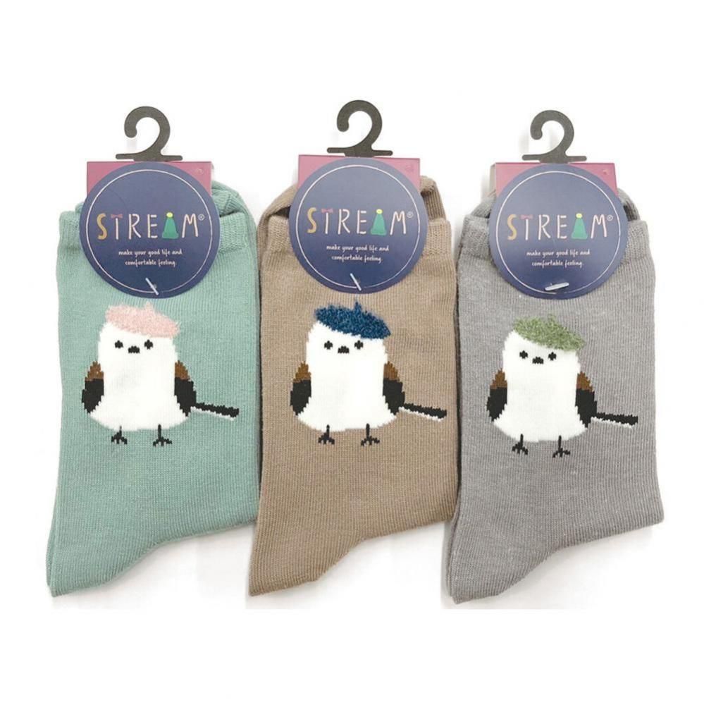 ベレー帽をかぶったシマエナガがワンポイントになった秋冬限定のクルーソックス。